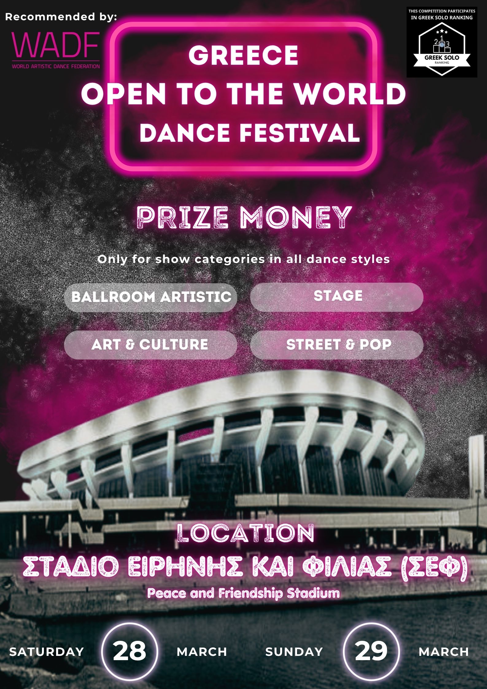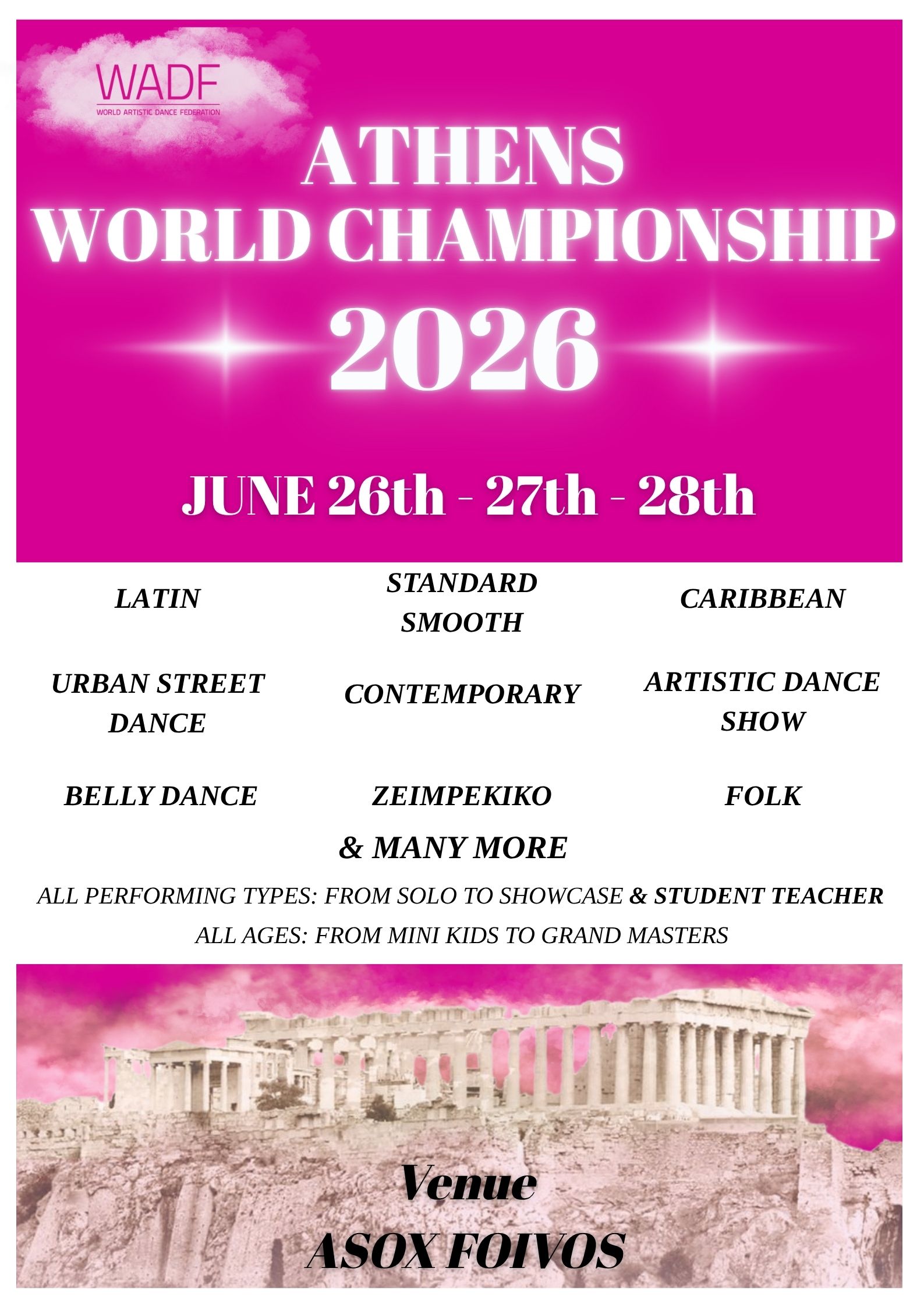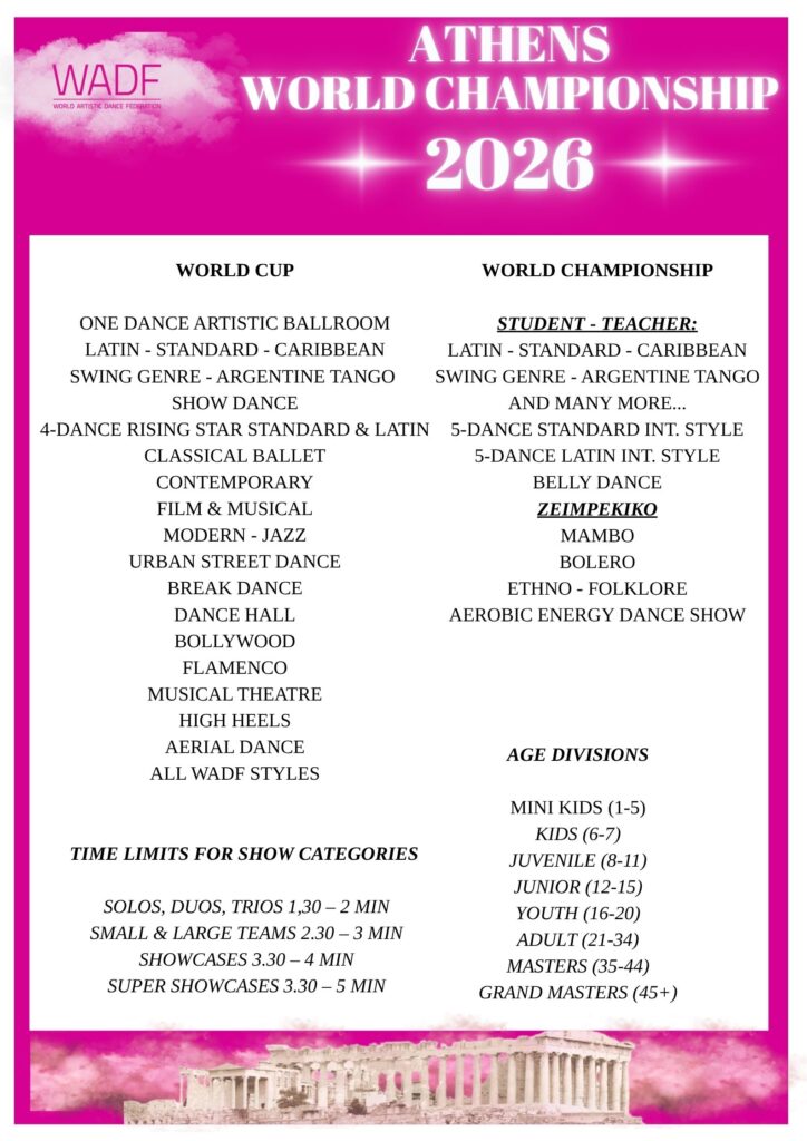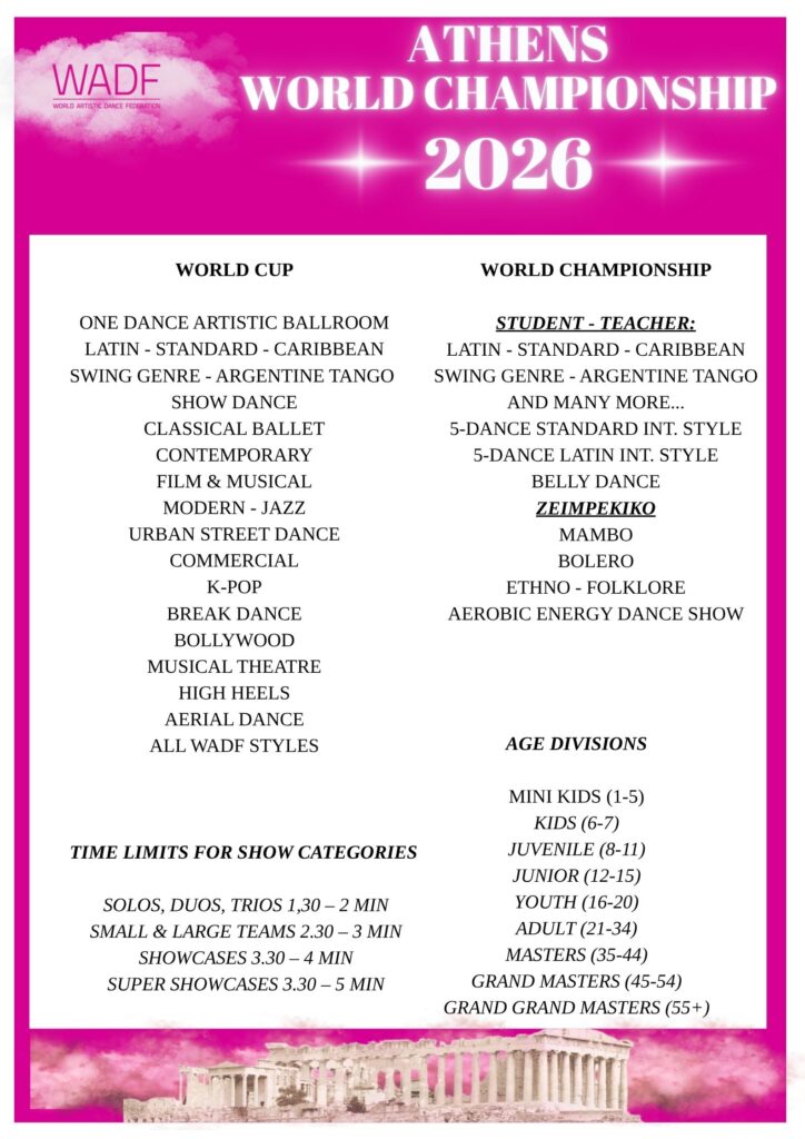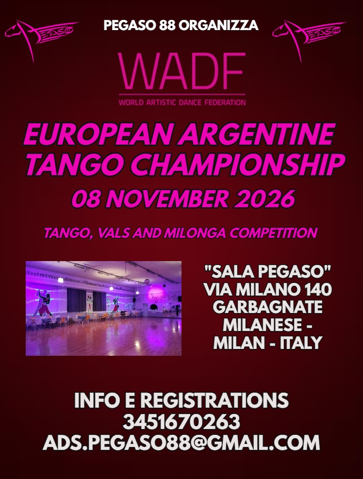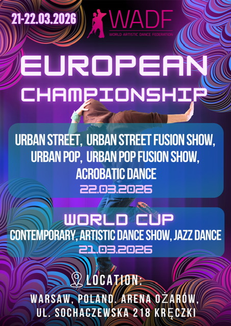 WADF Officially Granted title event. Dancers pay license fee 5 Euro to the organiser together with the enrolment fee.
