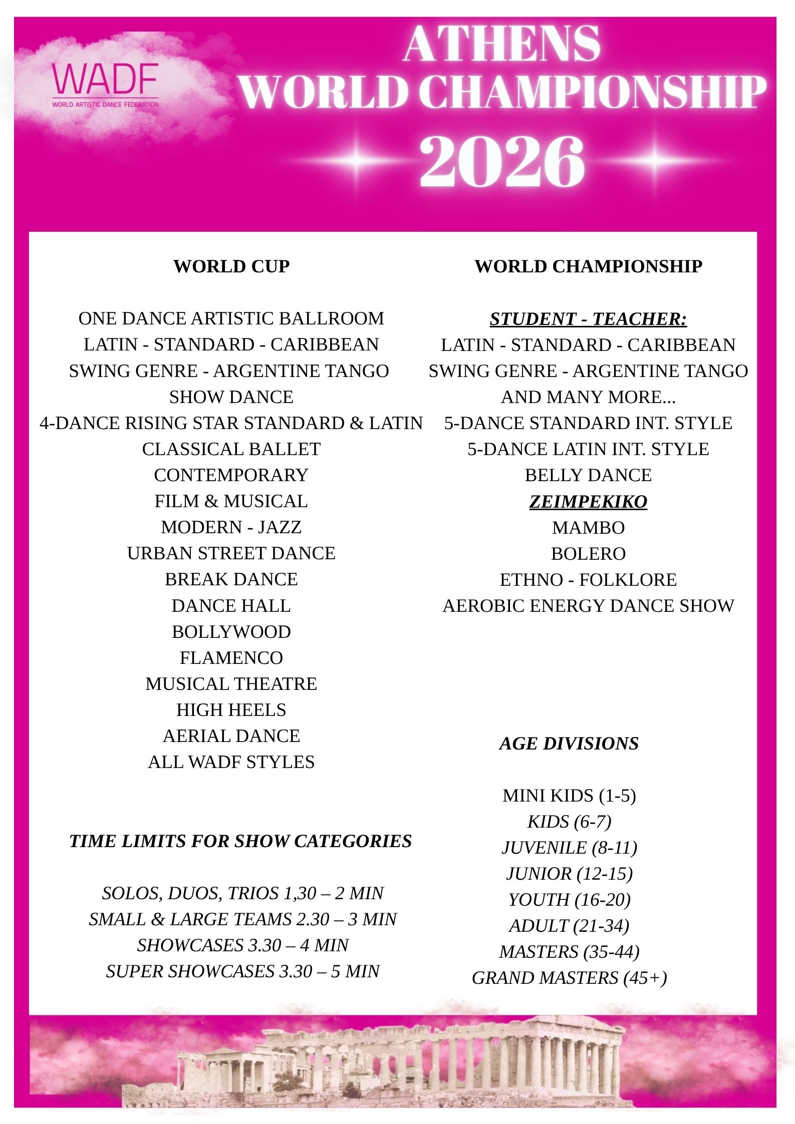 For all disciplines Categories: MiniKids- Juveniles- Junior – Youth – Adult – Master